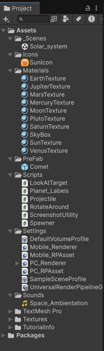 - Dynamic UI (Billboarding): Implemented a custom C# "Billboard" system for planetary labels. These labels automatically scale based on distance and always face the player, ensuring readability from any angle.